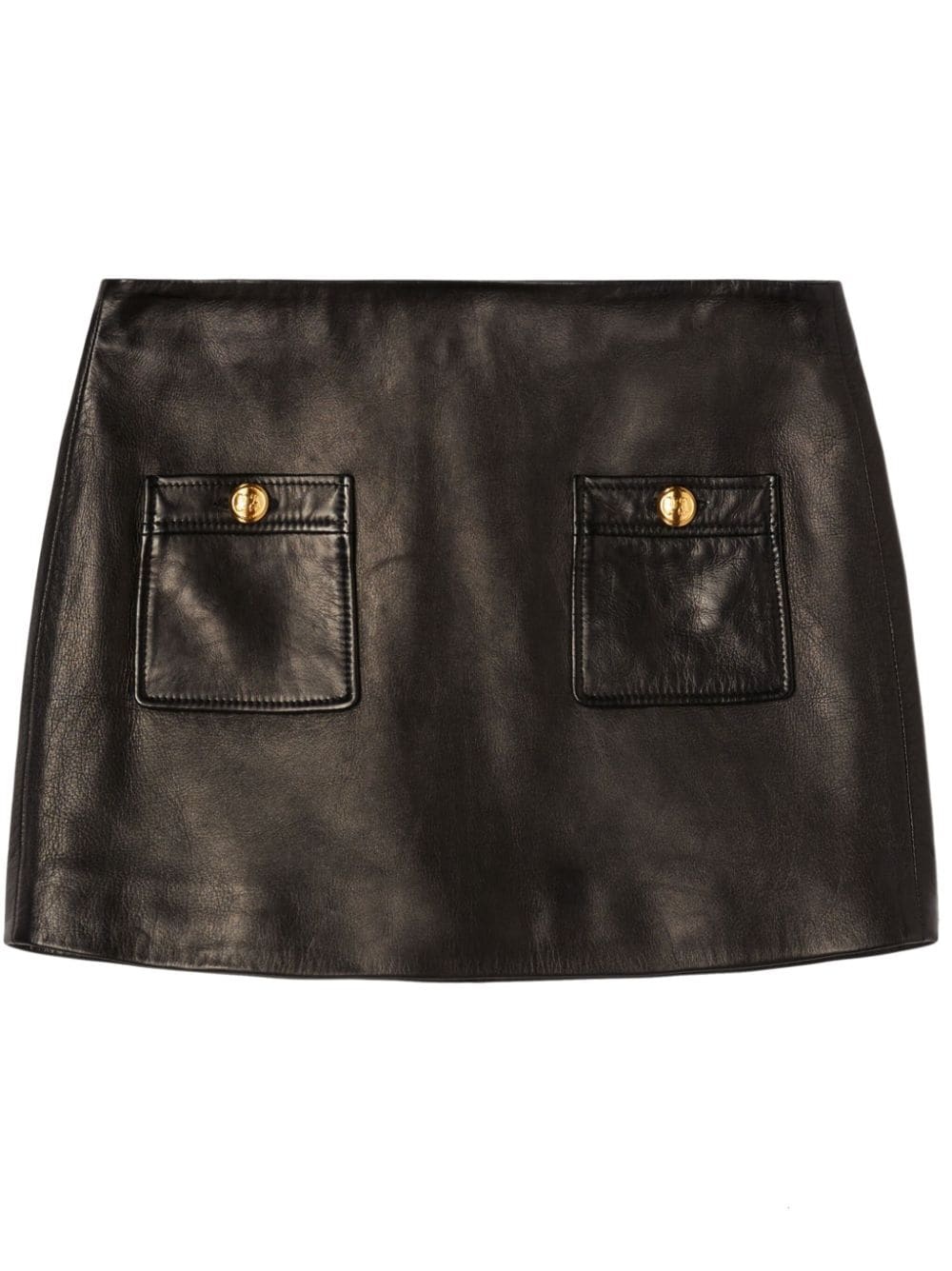 button-detail leather miniskirt Made from leather, this miniskirt by Palm Angels features a straight silhouette accented with retro-inspired pockets and gold-tone buttons at the front. Fastened with an invisible zip, this piece comes in a black colourway. Highlights - Black - Leather/cotton - Mid-rise - Concealed rear zip fastening - Two front patch pockets - Embossed gold-tone buttons - Straight hem - Thigh-length Imported Composition Cupro 100%, Cotton 100% Outer: Leather 100%