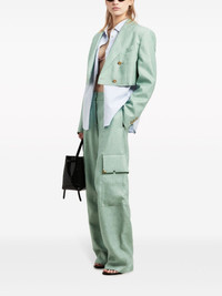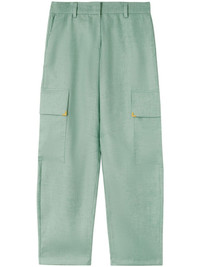 carrot-cut linen trousers Palm Angels' laidback style of the LA skate scene is reflected in these mint-green trousers. They're cut in Italy from linen to a loose, carrot silhouette with large utility-inspired flap pockets on the sides. Highlights - Mint green - Linen - Cotton - Mid-rise - Belt loops - Concealed front fastening - Two side slash pockets - Two side cargo pockets - Gold-tone hardware - Wide leg Made in Italy Composition Lining: Cotton 100% Outer: Linen/Flax 100% Washing instructions Read Manufacturer Guidelines