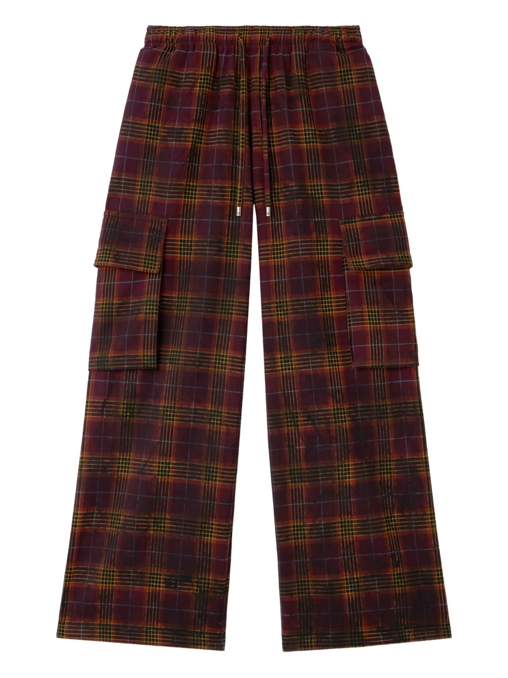 checked cargo pants Highlights - Burgundy - Check pattern - Elasticated waist - Drawstring fastening - Multiple cargo pockets - Rear logo tag Made in Italy Composition Polyester 62%, Viscose 35%, Elastane 3%