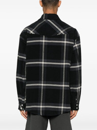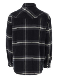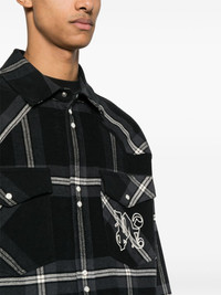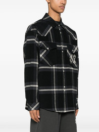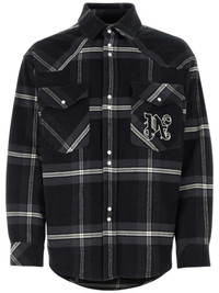 checked cotton-flannel shirt jacket Palm Angels' flannel shirt is adorned with a monochrome check pattern and a distinctive gothic-inspired logo print at the chest, echoing the brand’s affinity for classic styles with a twist. Highlights - Anthracite grey/white - Cotton - Flannel - Check pattern - Embroidered logo at the chest - Classic collar - Front press-stud fastening - Mother-of-pearl buttons - Long sleeves - Press-stud fastening cuffs - Two chest flap pockets - Unlined - Curved hem - Rfid authenticity tag Made in Italy Composition Cotton 100%, Polyester 100% Washing instructions Read Manufacturer Guidelines