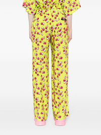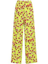 cherries-patterned flared trousers Highlights - Lime green/fuchsia pink - Textured finish - All-over cherries pattern - Elasticated waistband - Two side inset pockets - Piped-trim detailing - Rear patch pocket - Mini logo tag to the rear - Flared hem - Drawstring waist Made in Italy Composition Viscose 100% SIZE & FIT Model measurements Height 5 ft 9 in(1.75 m) Bust/Chest 34.64 in(88 cm) Hips 36.61 in(93 cm) Waist 26.37 in(67 cm) FittingInformation Designed with a wide-leg cut, these trousers allow for a close fit at the waist and offer a loose and roomy fit over the leg Adjust this piece’s waistband to your preference using the drawstring Made from a midweight non-stretch fabric This piece fits true to size – take your usual size Washing instructions Machine Wash