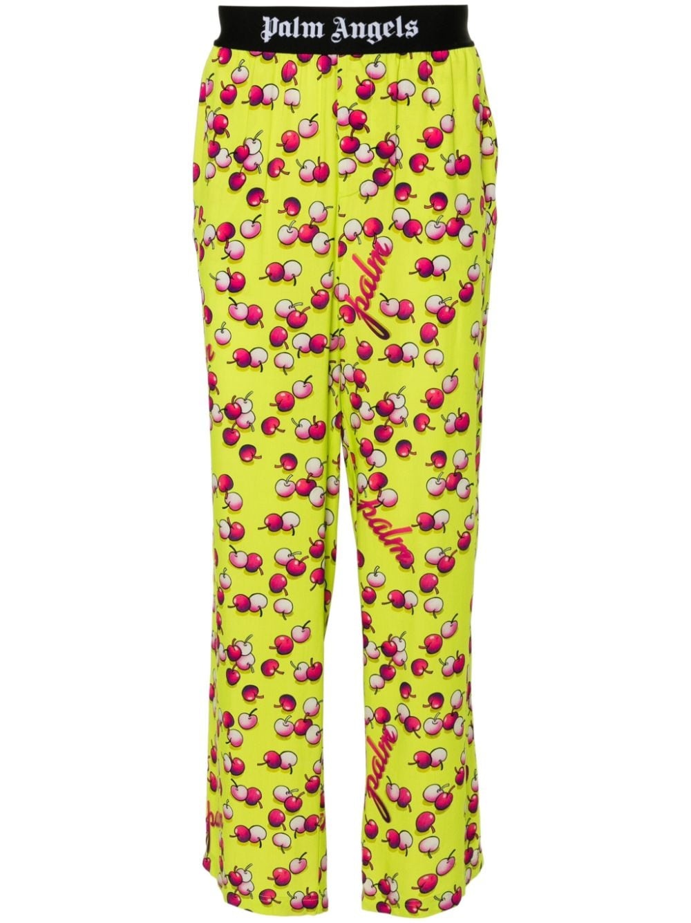cherry-print trousers Highlights - Chartreuse - All-over cherry print - Elasticated logo waistband - Two diagonal pockets to the sides - Rear welt pocket - Straight leg Made in Italy Composition Viscose 100%, Polyamide 67%, Polyester 23%, Elastane 10% SIZE & FIT Model measurements Height 6 ft 2 in(1.87 m) Bust/Chest 38.18 in(97 cm) Hips 36.61 in(93 cm) Waist 29.13 in(74 cm) FittingInformation Designed for a relaxed straight leg, allowing a comfortable and loose fit over the leg The elasticated waist allows for a comfortable fit Made from a lightweight non-stretch fabric This piece fits true to size – take your usual size Washing instructions Machine Wash