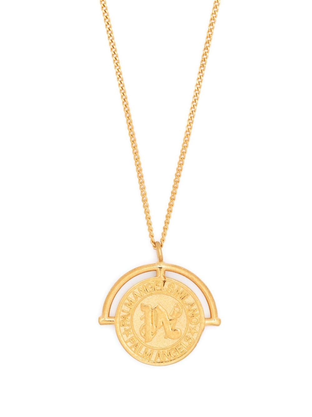 Chevalier monogram necklace Crafted from gold-tone brass with a polished finish, this Palm Angels necklace is designed with a timeless curb chain and a logo-engraved pendant. Highlights - Gold-tone - Brass - Engraved logo - Round pendant - Cable-link chain - Lobster claw fastening Made in Italy SIZE & FIT Model measurements Height 6 ft 2 in(1.87 m) Bust/Chest 36.41 in(92.5 cm) Hips 35.43 in(90 cm) Waist 29.52 in(75 cm) Measurement Length when open 20.86 in(53 cm) Minimum Length 18.11 in(46 cm) PENDANT LENGTH 0.78 in(2 cm) PENDANT WIDTH 0.78 in(2 cm) WIDTH 0.03 in(0.1 cm)