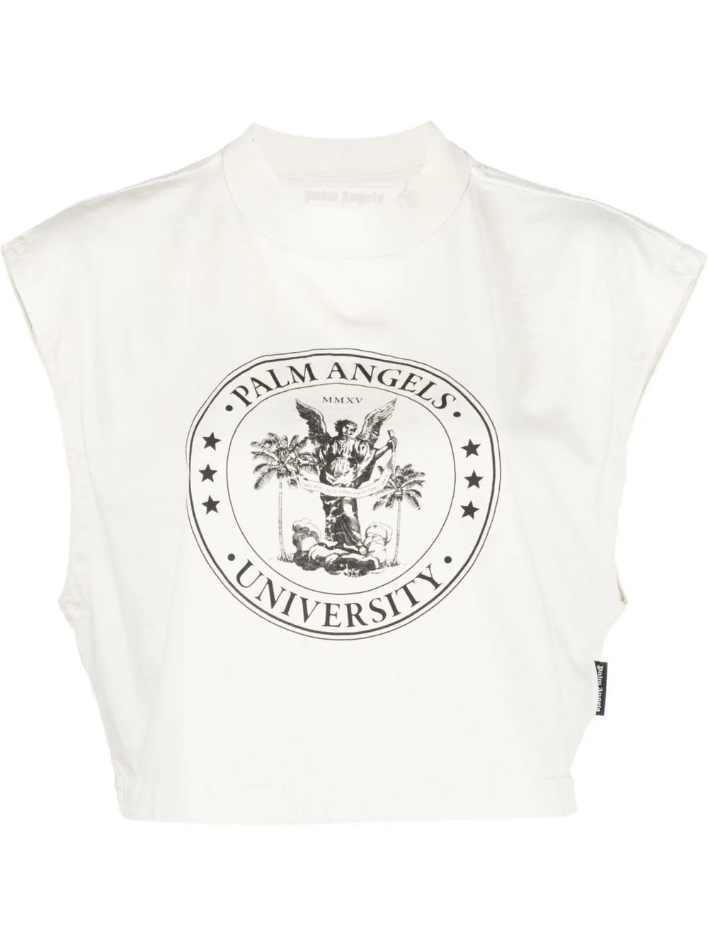 College logo-print muscle T-shirt Boasting Palm Angels' effortlessly relaxed aesthetic, this muscle T-shirt is adorned with the brand's college logo at the front in contrasting black. Made in Italy Composition Cotton 100% SIZE & FIT Model measurements Height 5 ft 9 in(1.76 m) Bust/Chest 31.88 in(81 cm) Hips 35.43 in(90 cm) Waist 24.8 in(63 cm) FittingInformation This piece fits true to size. We recommend you get your regular size Cut for a loose fit Made with a mid-weight fabric Washing instructions Machine Wash