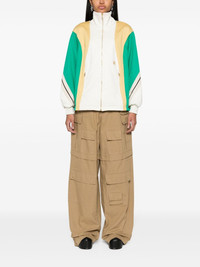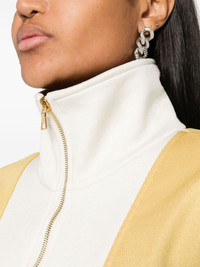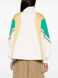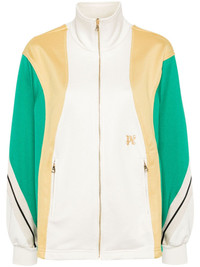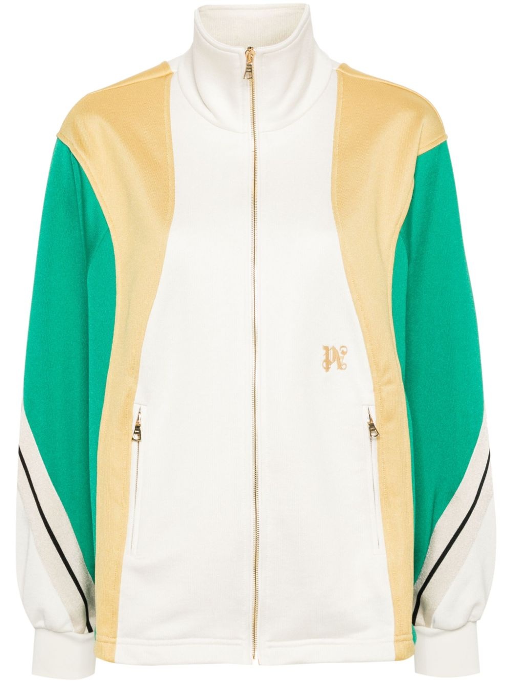 colour-block track jacket Catering to the brand's Californian roots, this Palm Angels track jacket is constructed in a colour block design, boasting three contrasting hues and the signature PA monogram embroidered at the chest. Highlights - Light beige/mustard yellow/bright green - Fine ribbed - Colour-block panelled design - Strap detailing - Stand-up collar - Long raglan sleeves with elasticated cuffs - Embroidered logo to the front - Two side zip-fastening pockets - French terry lining - Drawstring hem - Front zip fastening Made in Italy Composition Outer: Polyamide 91%, Polyester 55%, Cotton 45%, Elastane 9% Lining: Cotton 100% SIZE & FIT Model measurements Height 5 ft 11 in(1.8 m) Bust/Chest 30.7 in(78 cm) Hips 35.03 in(89 cm) Waist 24.4 in(62 cm) FittingInformation Designed to be unstructured, offering a loose fit throughout The adjustable drawstring means that you can adjust this piece’s fit to suit your comfort and preference Made from a midweight non-stretch fabric, this piece offers minimal elasticity when worn This piece fits true to size – take your usual size