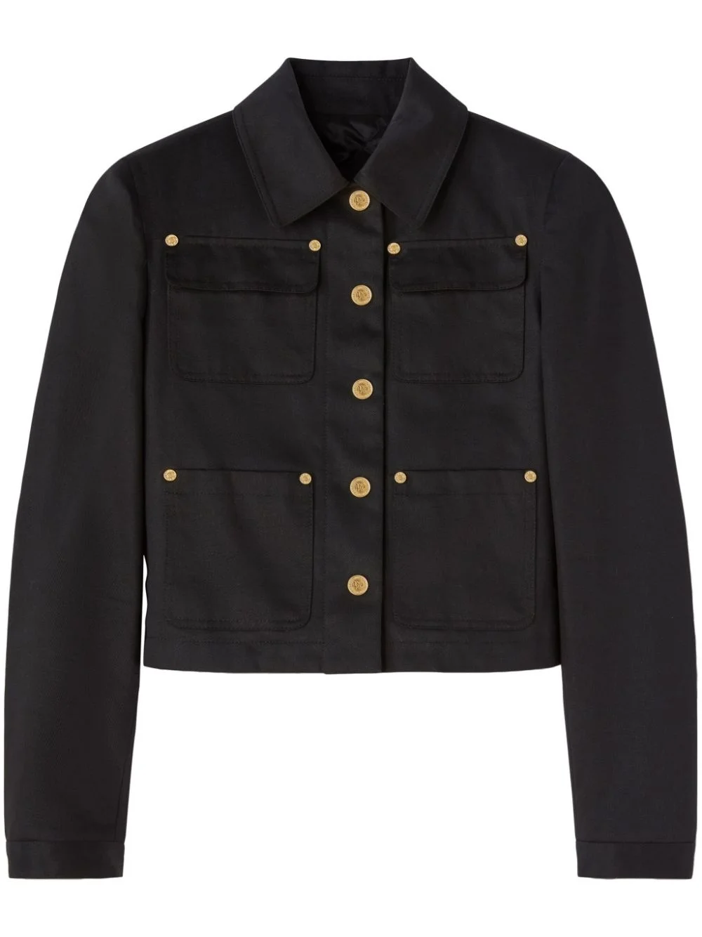 cotton-drill jacket Palm Angels puts its signature spin on this black utilitarian jacket, anchoring the flap and patch pockets with gold-tone logo rivets to match the front button fastening. Highlights - Black - Cotton - Rivet detailing - Gold-tone hardware - Classic collar - Front button fastening - Two chest flap pockets - Two front patch pockets - Long sleeves - Buttoned cuffs - Straight hem Made in Italy Composition Outer: Cotton 100% Lining: Viscose 100%, Cupro 100% Washing instructions Read Manufacturer Guidelines