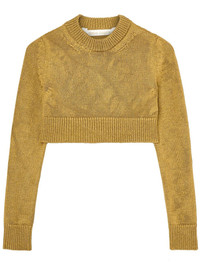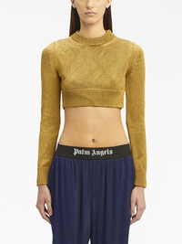 cropped laminated jumper Boasting a laminated finish, this cropped jumper by Palm Angels is rendered in a striking gold-tone hue, while the cropped hem adds a contemporary touch. Highlights - Gold-tone - Knitted construction - Laminated finish - Crew neck - Long sleeves - Ribbed trim - Cropped - Straight hem Made in Italy Composition Polyester 100% SIZE & FIT FittingInformation Cropped in length