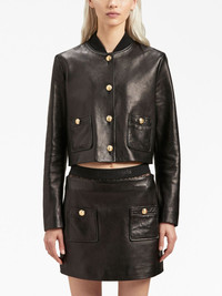 cropped leather jacket This leather jacket exhibits PALM ANGELS' innovative spirit with its cropped silhouette and ribbed collar. The brand's logo appears engraved into the gold-tone buttons, making the garment instantly recognisable. Highlights - Black - Leather - Ribbed band collar - Front button fastening - Long sleeves - Two front patch pockets - Straight hem - Cropped Imported Composition Lining: Cupro 100%, Cotton 100% Outer: Leather 100%