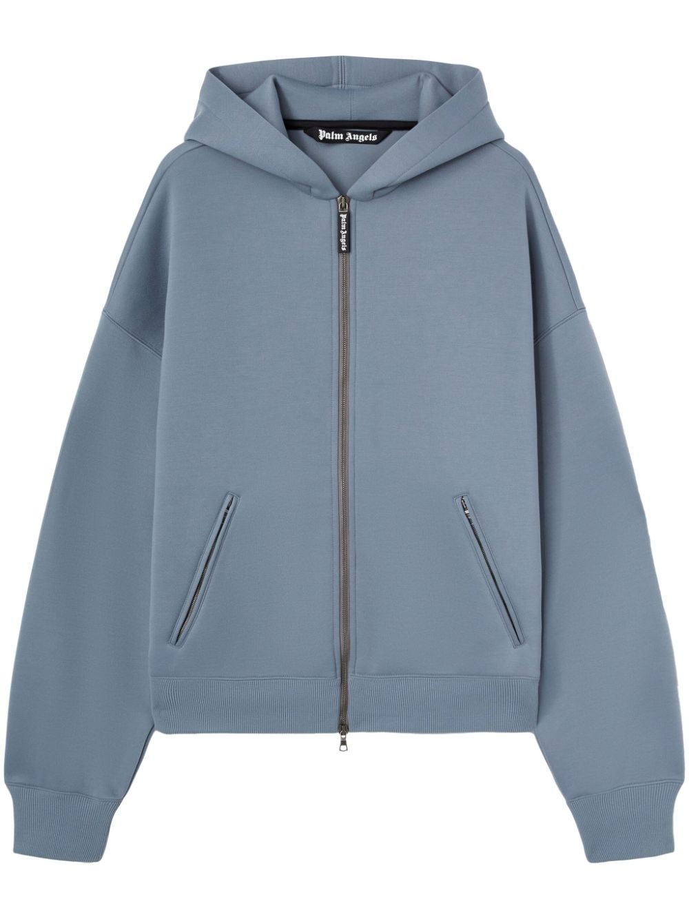 curved-logo hoodie Highlights - Blue-grey - Front zip fastening - Two front pouch pockets - Ribbed cuffs and hem Made in Italy Composition Polyester 100%