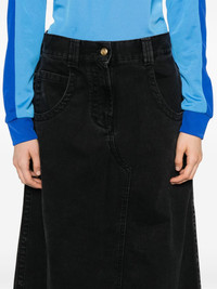 denim maxi skirt Highlights - Black - Cotton - Denim - Front button and zip fastening - Belt loops - Classic five pockets - Logo patch to the rear - Rear slit - Unlined - Frayed straight hem - Long length Made in Italy Composition Lining: Polyester 65%, Cotton 35% Outer: Cotton 100%, Leather 100% SIZE & FIT Model measurements Height 5 ft 9 in(1.76 m) Bust/Chest 34.25 in(87 cm) Hips 35.82 in(91 cm) Waist 23.62 in(60 cm) FittingInformation This maxi-length skirt is intended to be worn low on the hips The vented hem offers movement at the rear Sturdy and hard-wearing, this denim piece offers no stretch