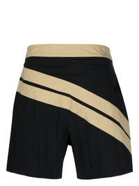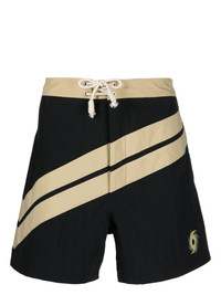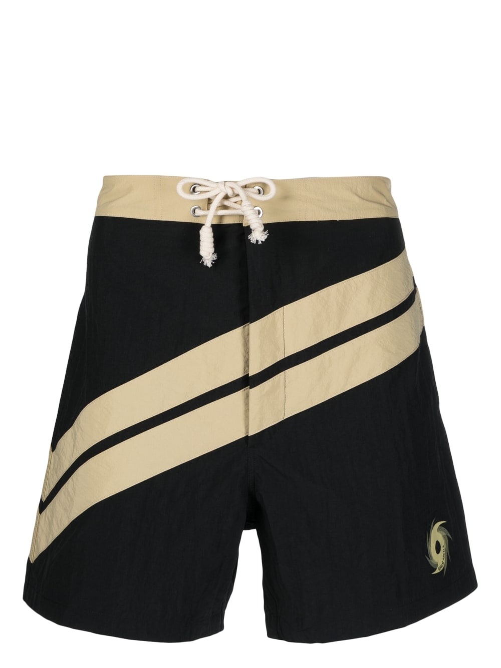 diagonal-stripe swim shorts These swim shorts by Palm angels are defined by their contrasting diagonal stripes. Designed for a relaxed fit, they channel the brand's laid-back attitude. Highlights - Black/camel - Diagonal stripe pattern - Logo print to the front - Elasticated drawstring waistband - Slip pockets to the sides - Rear welt pocket - Straight hem Made in Italy Composition Polyamide 100%, Polyester 100% Washing instructions Machine Wash