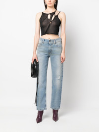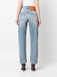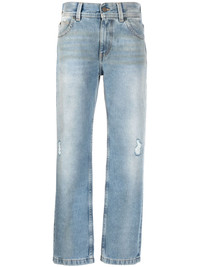 distressed-effect straight-leg jeans Offering a pared-back look, these Palm Angels jeans boast a versatile soft blue colourway. Crafted from pure cotton, a regular straight-leg speaks to the brand's casual aesthetic, as do the rips and distressed details throughout. Highlights - Light blue - Cotton - Distressed finish - Mid-rise - Button and concealed zip fastening - Belt loops - Five pockets - Rear leather logo patch - Straight legs Made in Italy Composition Outer: Cotton 100%, Calf Leather 100% Lining: Polyester 65%, Cotton 35% SIZE & FIT Model measurements Height 5 ft 10 in(1.78 m) Bust/Chest 31.49 in(80 cm) Hips 36.22 in(92 cm) Waist 25.59 in(65 cm) Washing instructions Machine Wash