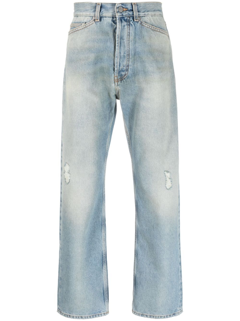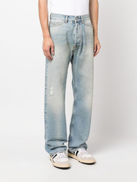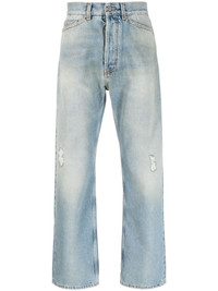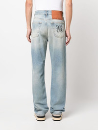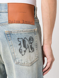 distressed straight-leg jeans Palm Angels' creations reflect the brand's relaxed aesthetic, as seen with these light wash jeans. Adorned with distressed detailing and a faded effect, the pair falls to a slightly baggy straight leg silhouette. Highlights - Light blue - Cotton - Denim - Faded effect - Distressed finish - Mid-rise - Belt loops - Front button and zip fastening - Classic five pockets - Straight leg Made in Italy Composition Outer: Cotton 100%, Leather 100% Lining: Polyester 65%, Cotton 35% SIZE & FIT Model measurements Height 6 ft 1 in(1.86 m) Bust/Chest 36.61 in(93 cm) Hips 37 in(94 cm) Waist 28.74 in(73 cm) FittingInformation Designed with a straight leg, these jeans allow for an unrestricted and comfortable fit over the leg Sturdy and hard-wearing, this denim piece offers no stretch This piece fits true to size – take your usual size