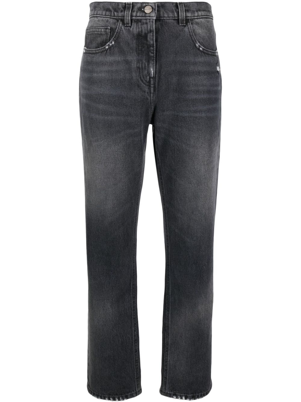 distressed straight-leg jeans Palm Angels' creations reflect the brand's relaxed aesthetic, as seen with these grey-wash jeans. Adorned with distressed detailing and a faded effect, the pair falls to a straight leg silhouette. Highlights - Charcoal grey - Cotton - Denim - Faded effect - Distressed effect - Whiskering effect - Mid-rise - Belt loops - Classic five pockets - Concealed butterfly clasp fastening - Concealed fly and button fastening - Logo patch to the rear - Straight leg Made in Italy Composition Lining: Polyester 65%, Cotton 35% Outer: Leather 100%, Cotton 100% Washing instructions Machine Wash