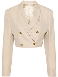 double-breasted cropped blazer Palm Angels tailors the traditional single-breasted blazer to a contemporary, cropped profile. This beige garment combines classic elements such as notched lapels with a raw-cut hem for a modern take on a classic style. Highlights - Beige - Twill weave - Peak lapels - Double-breasted button fastening - Shoulder pads - Buttoned cuffs - Chest welt pocket - Cropped straight hem - Satin lining Made in Italy Composition Outer: Polyester 65%, Cotton 35% Lining: Viscose 100% SIZE & FIT Model measurements Height 5 ft 11 in(1.8 m) Bust/Chest 34.25 in(87 cm) Hips 35.82 in(91 cm) Waist 24.8 in(63 cm) Measurement LENGTH 15.94 in(40.5 cm) BUST 37 in(94 cm) FittingInformation Designed for a relaxed fit, this piece allows for comfort and movement when worn The internal shoulder pads offer a structured shape Made from a midweight non-stretch fabric This piece fits true to size – take your usual size Washing instructions Machine Wash