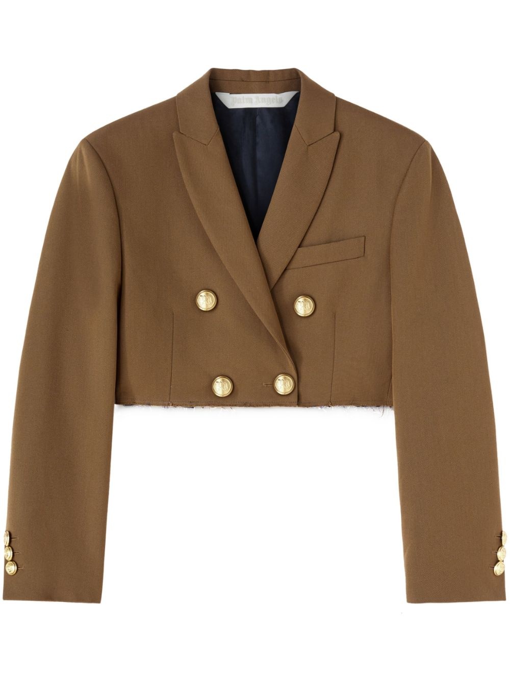 double-breasted cropped blazer Palm Angels' AW23 collection continues to infuse classic pieces with streetwear elements, as seen in this double-breasted blazer. Boasting structured shoulder and embossed gold-tone buttons, it gains a refreshing look with a raw-rut cropped silhouette. Highlights - Auburn brown - Cotton blend - Logo patch to the rear - Peak lapels - Double-breasted button fastening - Embossed gold-tone buttons - Chest welt pocket - Shoulder pads - Long sleeves - Buttoned cuffs - Straight hem - Raw-cut hem - Cropped Made in Italy Composition Cotton 100%