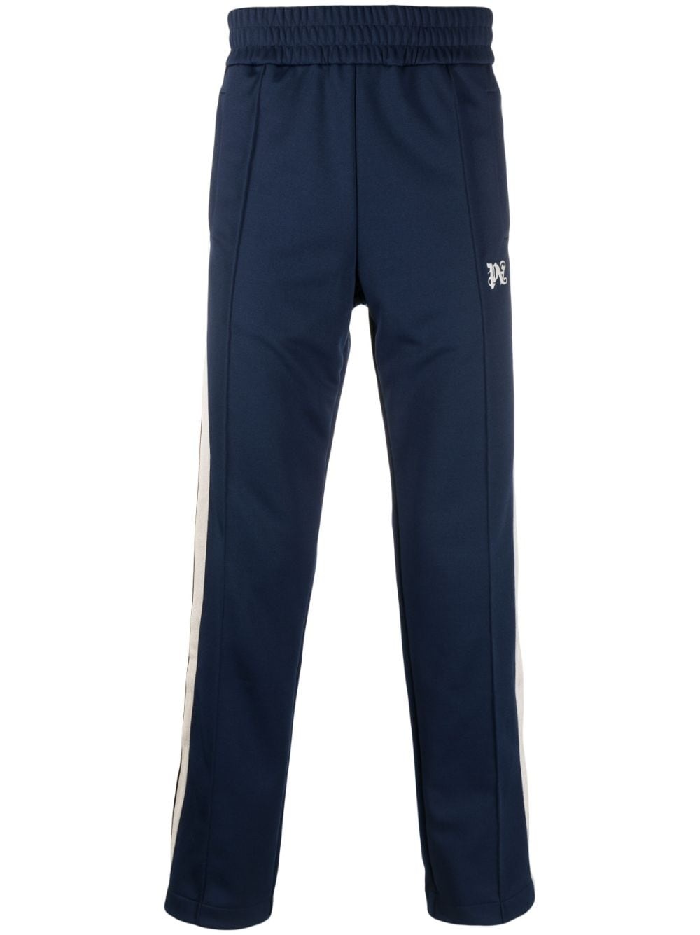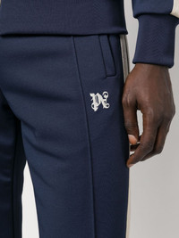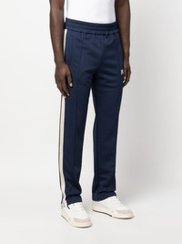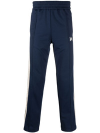 embroidered-monogram track pants Highlighted with striped tape to the sides, these Palm Angels' track pants are rendered in a navy blue and contrasting off-white colourway. They feature a straight-leg shape with exposed seams through the front and an embroidered logo at the leg. Highlights - Navy blue - Side stripe detailing - Embroidered monogram at the leg - Exposed-seam detailing - Elasticated waistband - Two side inset pockets Made in Italy Composition Lining: Recycled Polyester 100% Outer: Recycled Polyester 100% SIZE & FIT Model measurements Height 6 ft 0 in(1.84 m) Bust/Chest 35.82 in(91 cm) Hips 37 in(94 cm) Waist 28.34 in(72 cm) FittingInformation Designed for a relaxed tapered leg, allowing a comfortable loose fit above the knee with a closer fit towards the calves The elasticated waist allows for a comfortable fit Made from a midweight non-stretch fabric, this piece offers minimal elasticity when worn This piece fits true to size – take your usual size Washing instructions Hand Wash