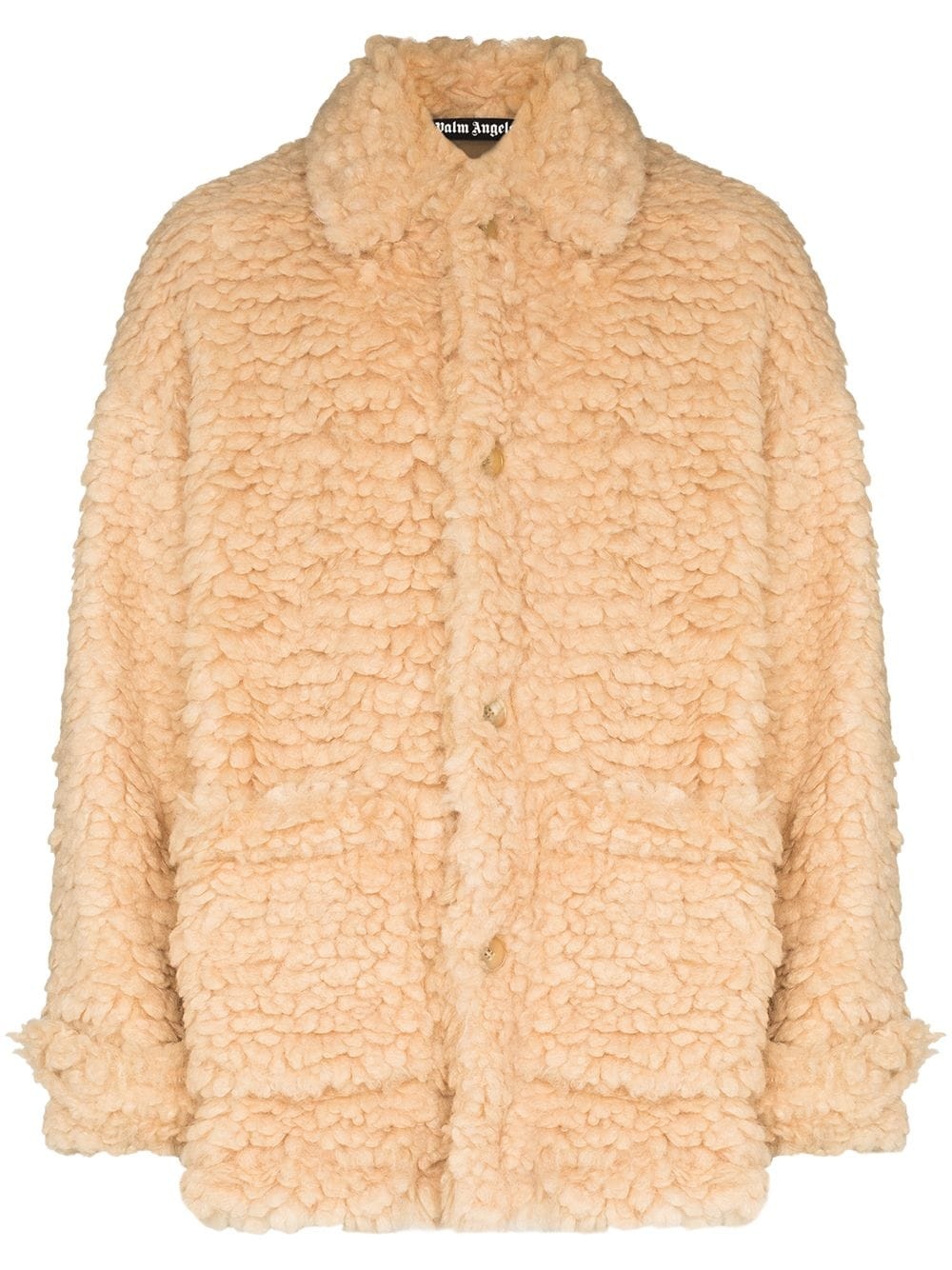 faux-shearling single-breasted short coat Palm Angels presents this faux-shearling coat as part of the label's AW21 collection. Fabricated in Italy, it features a full lining and two front patch pockets. Made in Italy Composition Outer: Polyester 100% Lining: Viscose 100% SIZE & FIT Model measurements Height 6 ft 1 in(1.86 m) Bust/Chest 32.67 in(83 cm) Hips 35.03 in(89 cm) Waist 25.98 in(66 cm) FittingInformation This piece fits true to size. We recommend you get your regular size Cut for a loose fit Made with a mid-weight non-stretch fabric Washing instructions Dry Clean Only