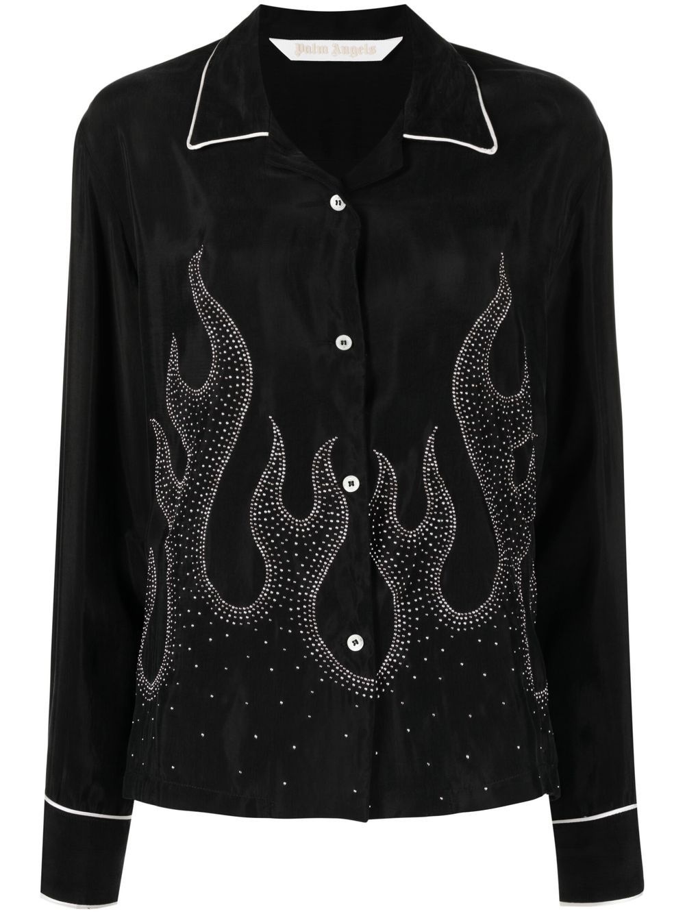 flame-embroidered shirt Palm Angels harnesses their LA influences with this shirt. Against a black backdrop, crystal embellishments form a classic flames motif reminiscent of motorbike detailing. Made in Italy Composition Cupro 100%, Aluminium 100%, Polyester 100% SIZE & FIT Model measurements Height 5 ft 10 in(1.78 m) Bust/Chest 29.92 in(76 cm) Hips 34.64 in(88 cm) Waist 23.62 in(60 cm) FittingInformation This piece fits true to size. We recommend you get your regular size Cut for a loose fit Made with a mid-weight non-stretch fabric Washing instructions Hand Wash