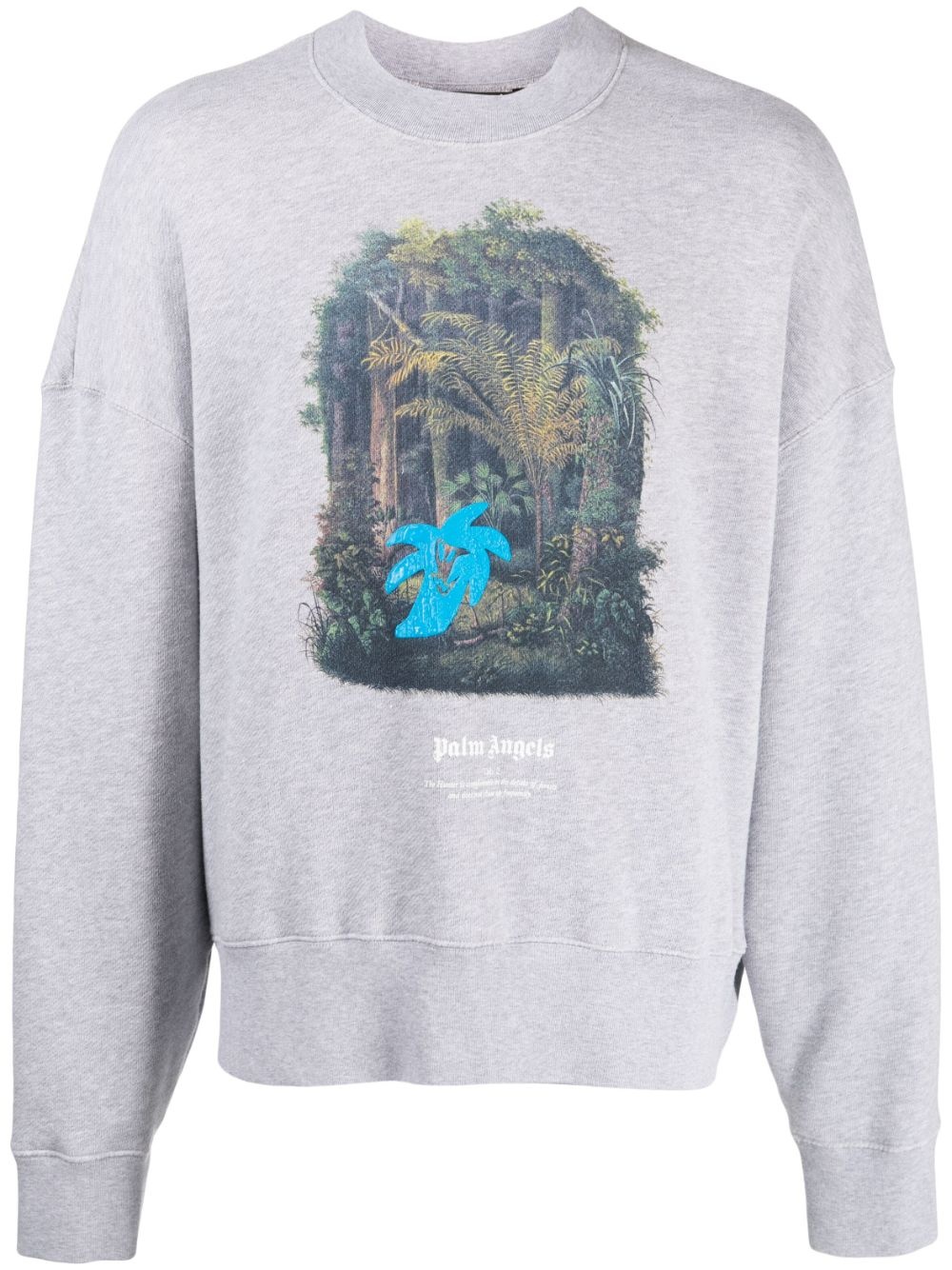 graphic-print cotton sweatshirt Emblazoned with a forest graphic print that contrasts the melange grey backdrop, this cotton-spun sweatshirt from Palm Angels reflects the brand bold Californian-inspired aesthetic. Highlights - Medium grey - Cotton - Melange effect - Graphic print to the front - Crew neck - Long sleeves - Straight hem Made in Italy Composition Cotton 100% SIZE & FIT Model measurements Height 6 ft 2 in(1.87 m) Bust/Chest 34.25 in(87 cm) Hips 36.22 in(92 cm) Waist 29.52 in(75 cm) FittingInformation Designed to be unstructured, offering a loose fit throughout Constructed with additional length on the sleeve Made from a midweight non-stretch fabric, this piece offers minimal elasticity when worn This piece fits true to size – take your usual size Washing instructions Machine Wash