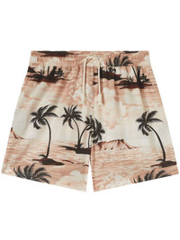 Dream drawstring swim shorts In a black and beige colourway, these swim shorts from Palm Angels boast the brand's iconic palm tree print all over. The pair is finished with an elasticated drawstring waistband. Highlights - Beige/black - Palm tree print - Drawstring fastening waist - Two side slit pockets - Rear flap pocket - Be mindful to try on swimwear over your own garments. Made in Italy Composition Polyester 100% Washing instructions Hand Wash