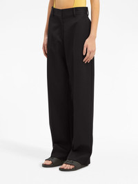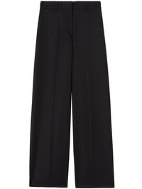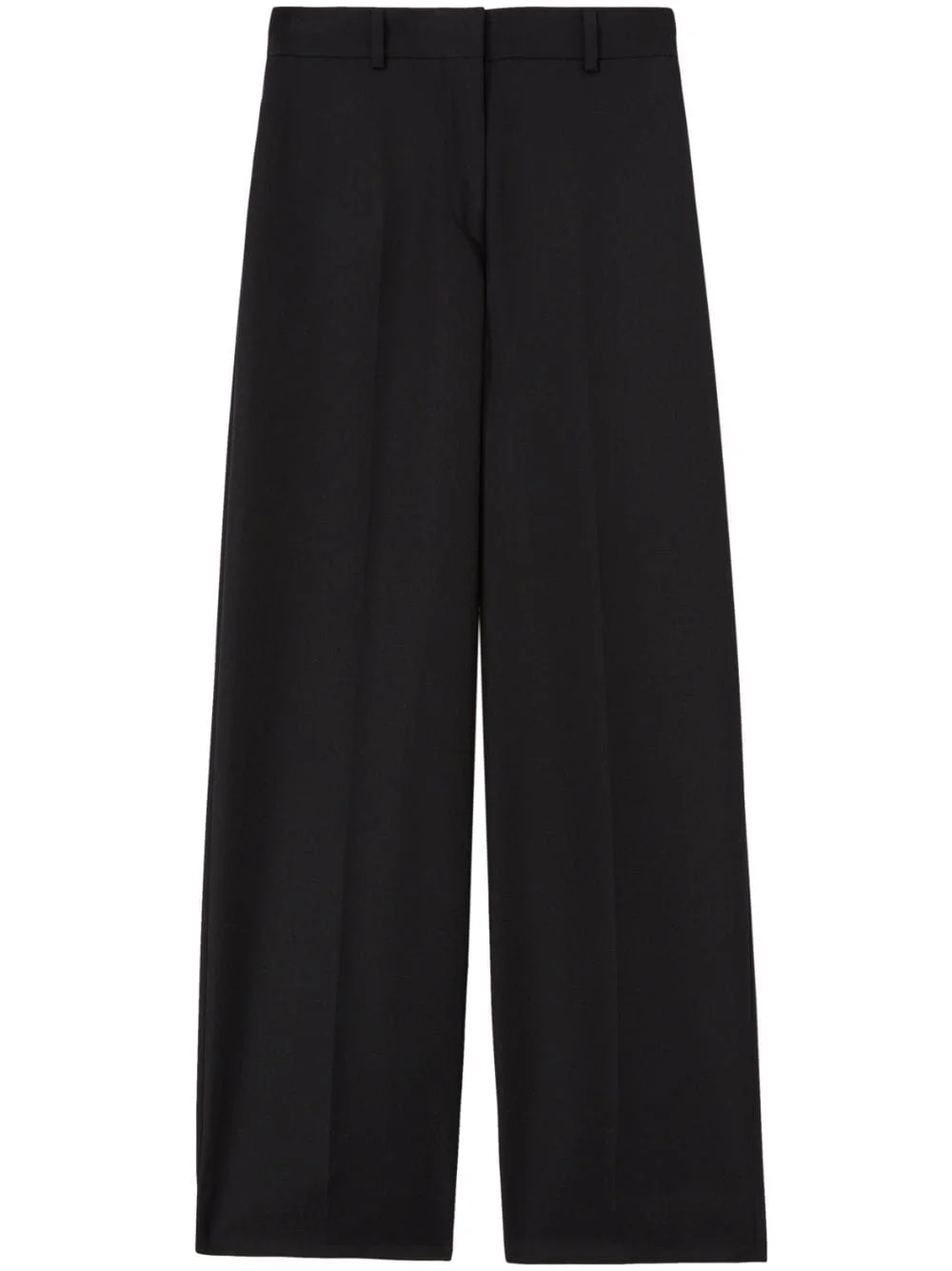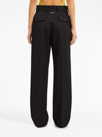 high-rise straight-leg trousers Palm Angels presents elegant formal tailoring in the form of these wide-leg trousers. Spun from a virgin-wool blend, this high-rise piece is elevated with the brand's logo patch at the rear for a branded touch. Highlights - Black - Virgin wool blend - High waist - Belt loops - Concealed front fastening - Two side slit pockets - Two rear flap pockets - Logo patch to the rear - Straight leg Made in Italy Composition Outer: Polyester 55%, Virgin Wool 45% Lining: Cotton 100% SIZE & FIT Measurement WAIST 29.13 in(74 cm) FittingInformation Designed for a straight-leg fit, these trousers allow for a close fit at the waist and an unrestricted, comfortable fit over the leg This piece fits true to size – take your usual size