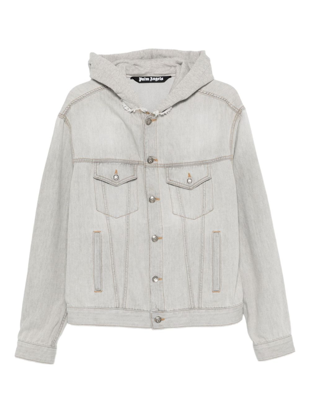 hooded denim jacket Highlights - Light grey - Cotton - Hooded neckline - Button fastening - Chest flap pockets - Frayed detailing Imported Composition Outer: Cotton 100%, Calf Leather 100% Lining: Polyester 35%, Cotton 35% SIZE & FIT Model measurements Height 6 ft 1 in(1.85 m) Bust/Chest 38.58 in(98 cm) Hips 37 in(94 cm) Waist 30.31 in(77 cm) Washing instructions Machine Wash