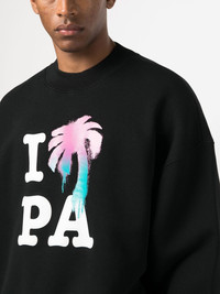 I Love PA crew-neck sweatshirt Made from soft cotton and cut for a relaxed fit, this crew neck sweatshirt from Palm Angels is adorned with the brand's seasonal I Love PA motif - a nod to its Californian roots. Highlights - Black/multicolour - Organic cotton - Graphic print to the front - Crew neck - Drop shoulder - Long sleeves - Straight hem Imported Composition Cotton 100%, Polyester 100% SIZE & FIT Model measurements Height 6 ft 1 in(1.85 m) Bust/Chest 38.58 in(98 cm) Hips 37 in(94 cm) Waist 30.31 in(77 cm) Measurement CHEST 53.54 in(136 cm) SLEEVE LENGTH 22.44 in(57 cm) LENGTH 24.4 in(62 cm) FittingInformation This piece fits true to size. We recommend you get your regular size Cut for a loose fit Made with a mid-weight fabric