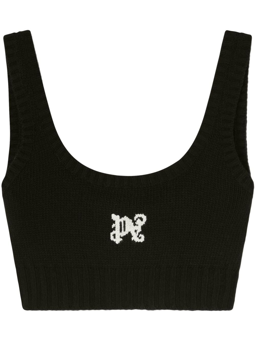intarsia knit-logo crop top black/off-white wool blend knitted construction intarsia-knit logo scoop neck sleeveless ribbed hem cropped Made in Italy Composition Wool 50%, Acrylic 50%, Merino 40%, Viscose 30%, Polyamide 20%, Cashmere 10%