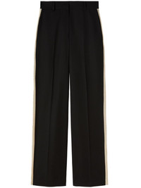knit-tape straight trousers Inspired by the Los Angeles skateboard scene, PALM ANGELS creates streetwear garments with a creative yet relaxed feel. A case in point, these trousers are crafted from a virgin wool blend and embellished with beige knit tape on the side. Highlights - Black/light beige - Virgin wool blend/cotton - Straight leg - Side stripe detailing - Logo patch to the rear - Mid-rise - Belt loops - Concealed front fastening - Two side slit pockets - Two rear flap pockets Made in Italy Composition Outer: Polyester 55%, Virgin Wool 45% Lining: Cotton 100% Washing instructions Read Manufacturer Guidelines