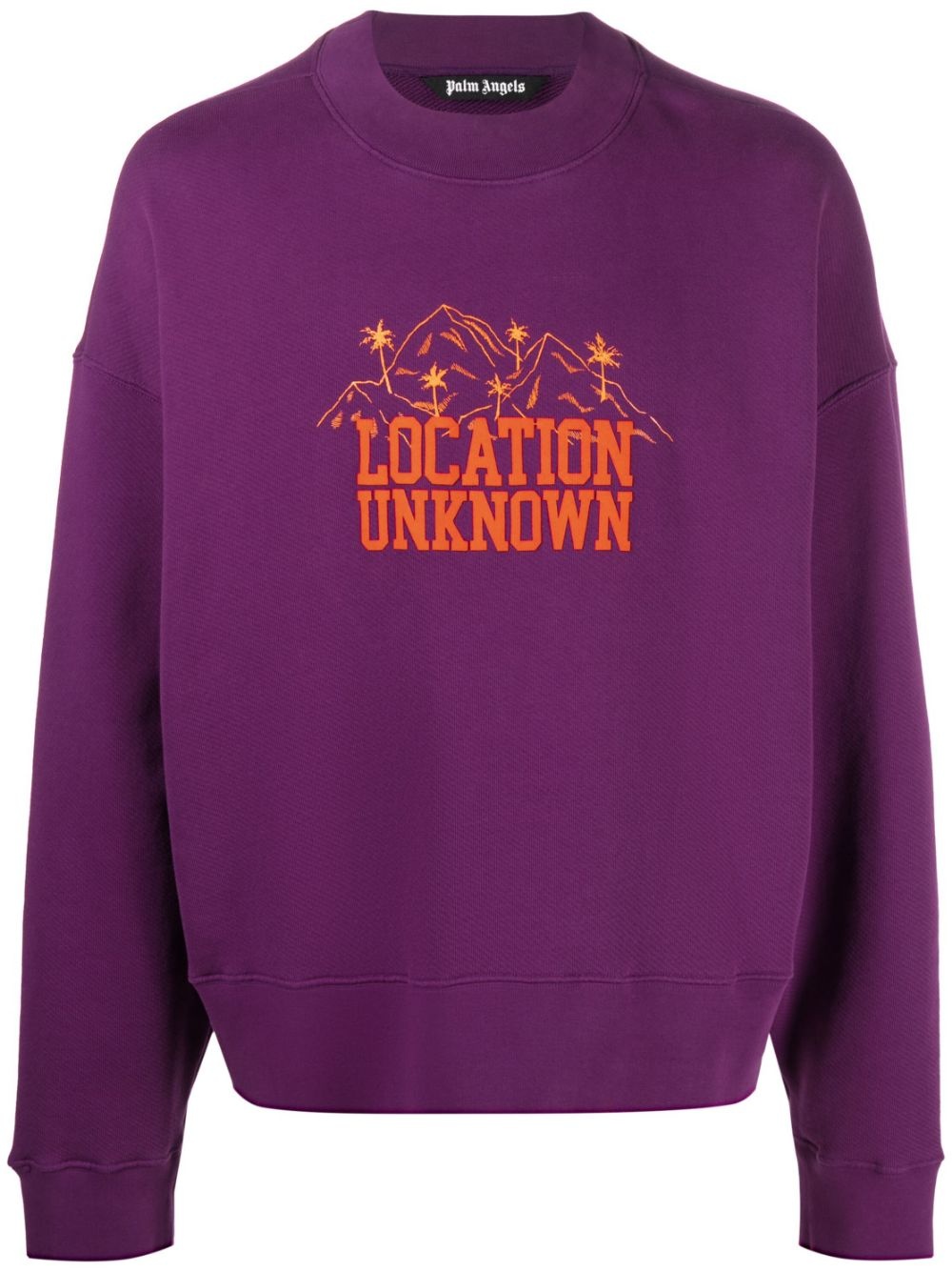 Location Unknown crew neck sweatshirt Palm Angels present this Location Unknown crew neck sweatshirt with a bright purple hue and constructed from cotton blend fabric. Imported Composition Cotton 100%, Polyester 100% SIZE & FIT Model measurements Height 6 ft 1 in(1.85 m) Bust/Chest 34.64 in(88 cm) Hips 34.25 in(87 cm) Waist 27.55 in(70 cm) FittingInformation This piece fits true to size. We recommend you get your regular size Cut for a loose fit Made with a mid-weight fabric Washing instructions Hand Wash