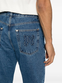 logo-embossed straight-leg jeans Cut to a relaxed straight-leg silhouette, these Palm Angels jeans are reflective of the brand's Los Angeles skater inspiration. They're simply embellished with the iconic monogram at the back pocket. Highlights - Blue - Cotton - Denim - Mid-wash - Contrast stitching - Belt loops at the waist - Logo-engraved button - Classic five pockets - Patch detail at the front - Embossed logo to the rear - Internal logo tag - Straight leg and hem - Front button and zip fastening Made in Italy Composition Cotton 100% SIZE & FIT Model measurements Height 6 ft 2 in(1.87 m) Bust/Chest 38.18 in(97 cm) Hips 36.61 in(93 cm) Waist 29.13 in(74 cm) FittingInformation Designed with a straight leg, these jeans allow for an unrestricted and comfortable fit over the leg Sturdy and hard-wearing, this denim piece offers no stretch This piece fits true to size – take your usual size