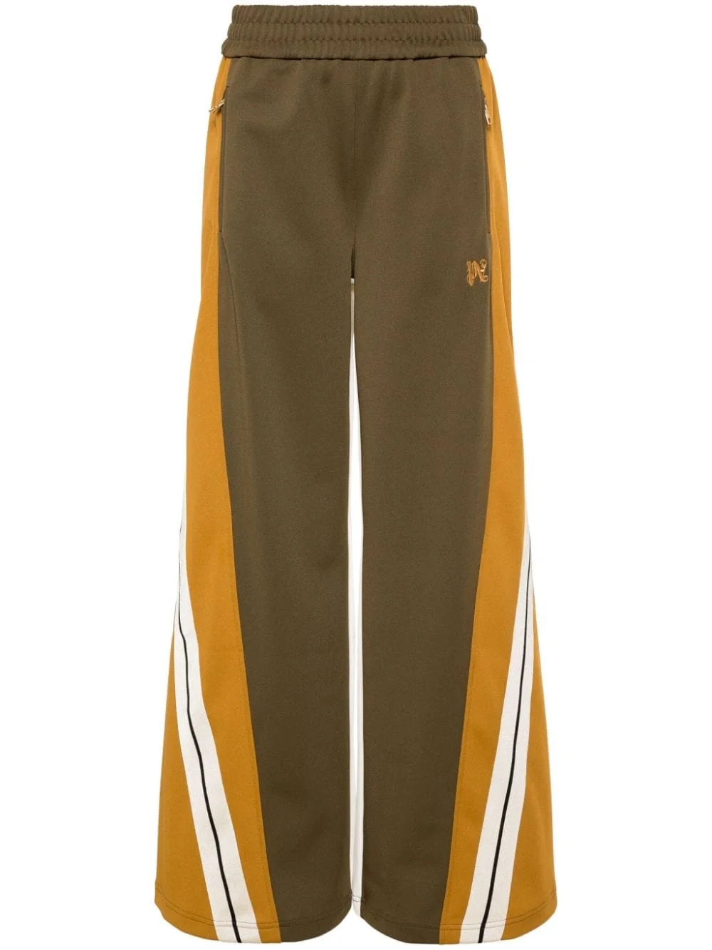 logo-embroidered colourblock track pants Highlights - Military golden brown/multicolour - Recycled polyester - Jersey texture - Colour-block panelled design - Diagonal stripe detailing - Two side zip-fastening pockets - Embroidered logo at the leg - Full-length - Wide leg - Elasticated waistband Made in Italy Composition Lining: Polyester 100% Outer: Recycled Polyester 100% SIZE & FIT Model measurements Height 5 ft 10 in(1.77 m) Bust/Chest 32.28 in(82 cm) Hips 35.03 in(89 cm) Waist 25.19 in(64 cm) FittingInformation Designed with a wide-leg cut, these trousers allow for a close fit at the waist and offer a loose and roomy fit over the leg The elasticated waist allows for a comfortable fit Made from a midweight non-stretch fabric, this piece offers minimal elasticity when worn This piece fits true to size – take your usual size Washing instructions Hand Wash
