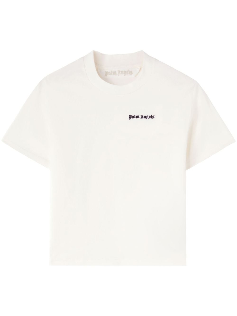 logo-embroidered cotton T-shirt Inspired by the Los Angeles skateboard scene and the founder's Italian heritage, Palm Angels creates refined pieces with streetwear influences. Seen on this short-sleeve T-shirt, the garment features an embroidered logo at the chest in a contrasting colourway which ties in with current branding trends. Highlights - White/black - Cotton - Crew neck - Embroidered logo at the chest - Short sleeves - Straight hem - Cropped Made in Italy Composition Cotton 100%, Polyester 100% Washing instructions Read Manufacturer Guidelines