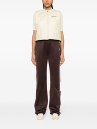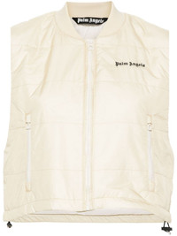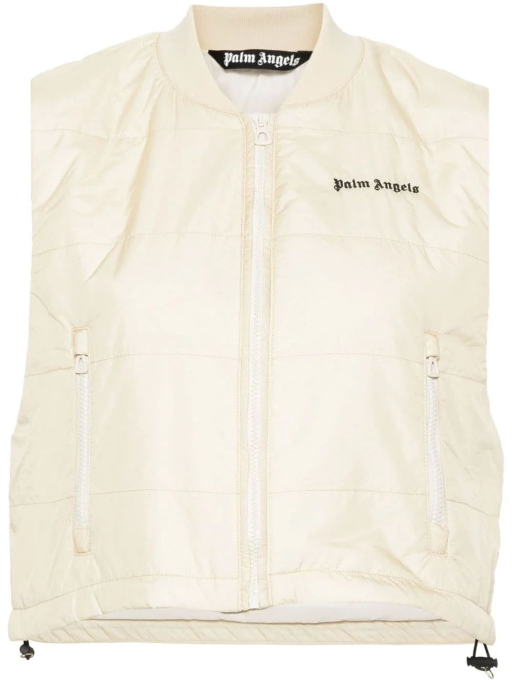logo-print down vest Highlights - Cream white - Quilted - Embroidered logo at the chest - Tonal hardware - Baseball collar - Front zip fastening - Sleeveless - Two side zip-fastening pockets - Full lining - Drawstring hem - Cropped Imported Composition Outer: Polyester 100%, Polyamide 100% Lining: Polyamide 100%, Polyester 100% SIZE & FIT Model measurements Height 5 ft 10 in(1.78 m) Bust/Chest 33.07 in(84 cm) Hips 36.61 in(93 cm) Waist 24.8 in(63 cm) Measurement LENGTH 19.29 in(49 cm) WAIST 43.3 in(110 cm) BUST 42.51 in(108 cm) FittingInformation Designed for a boxy fit, intended for a loose fit throughout The internal drawstring at the hem allows for fitted preferences Made from a quilted non-stretch fabric, giving it no natural elasticity This piece fits true to size – take your usual size Washing instructions Machine Wash