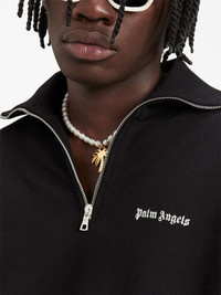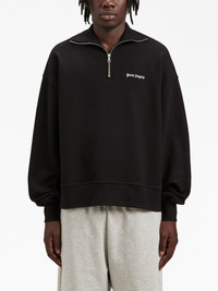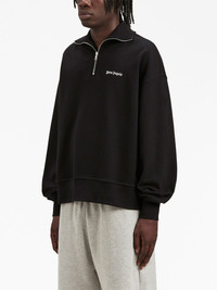 logo-embroidered half-zip sweatshirt Palm Angels showcases an understated streetwear aesthetic with this sweatshirt. Crafted in Italy, the half-zip design arrives in a jet black colourway and features the brand’s iconic gothic-font logo embroidered at the chest. Highlights - Black - Cotton - Embroidered logo at the chest - Half front zip fastening - High neck - Long sleeves - Straight hem Made in Italy Composition Outer: Cotton 100% Lining: Cotton 100% SIZE & FIT FittingInformation Designed for an oversized fit, offering additional room throughout This piece fits true to size – take your usual size