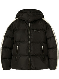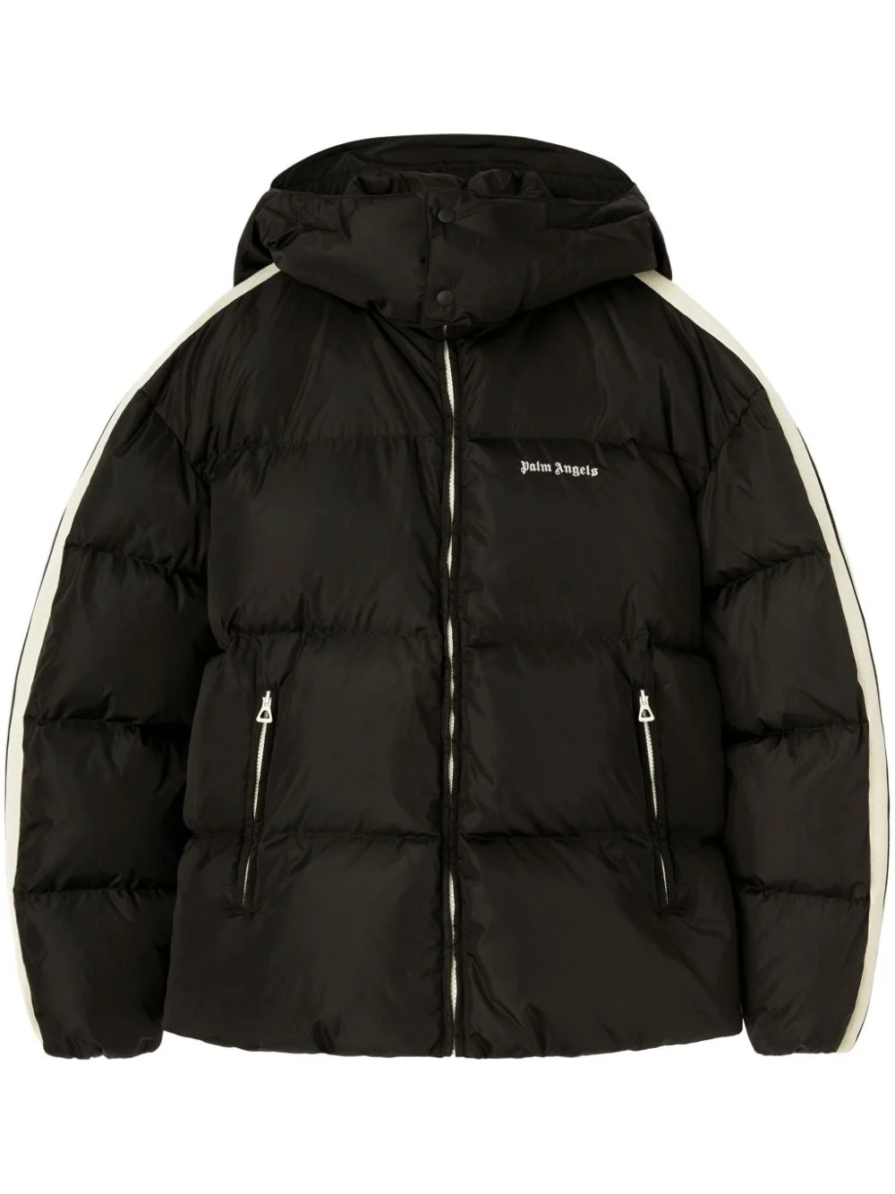 logo-embroidered hooded puffer jacket Highlights - Black/off-white - Feather down - Padded design - Quilted - Embroidered logo at the chest - Side stripe detailing - Classic hood - High neck - Front zip fastening - Drop shoulder - Long sleeves - Elasticated cuffs - Front zip fastening pockets - Straight hem Made in Italy Composition Lining: Feather Down 100%, Polyamide 100% Outer: Polyamide 100% Washing instructions Read Manufacturer Guidelines