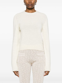 curved-logo wool-blend jumper This white Palm Angels jumper draws inspiration from vintage garms and streetwear culture. It’s knitted with wool threads and embroidered with a curved Old English logo at the back. Highlights - Ivory white - Wool blend - Knitted construction - Crew neck - Long sleeves - Embroidered logo to the rear - Ribbed trim - Curved high-low hem Made in Italy Composition Wool 80%, Polyamide 20% SIZE & FIT Model measurements Height 5 ft 11 in(1.8 m) Bust/Chest 31.49 in(80 cm) Hips 36.61 in(93 cm) Waist 24.4 in(62 cm) FittingInformation Designed for a slim fit that sits just away from the body offering a close yet comfortable fit Made with a midweight knit, this piece offers some stretch This piece fits true to size – take your usual size Washing instructions Hand Wash