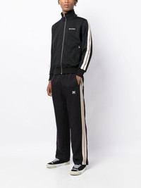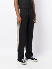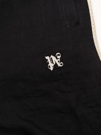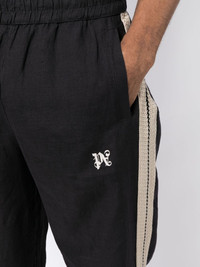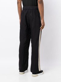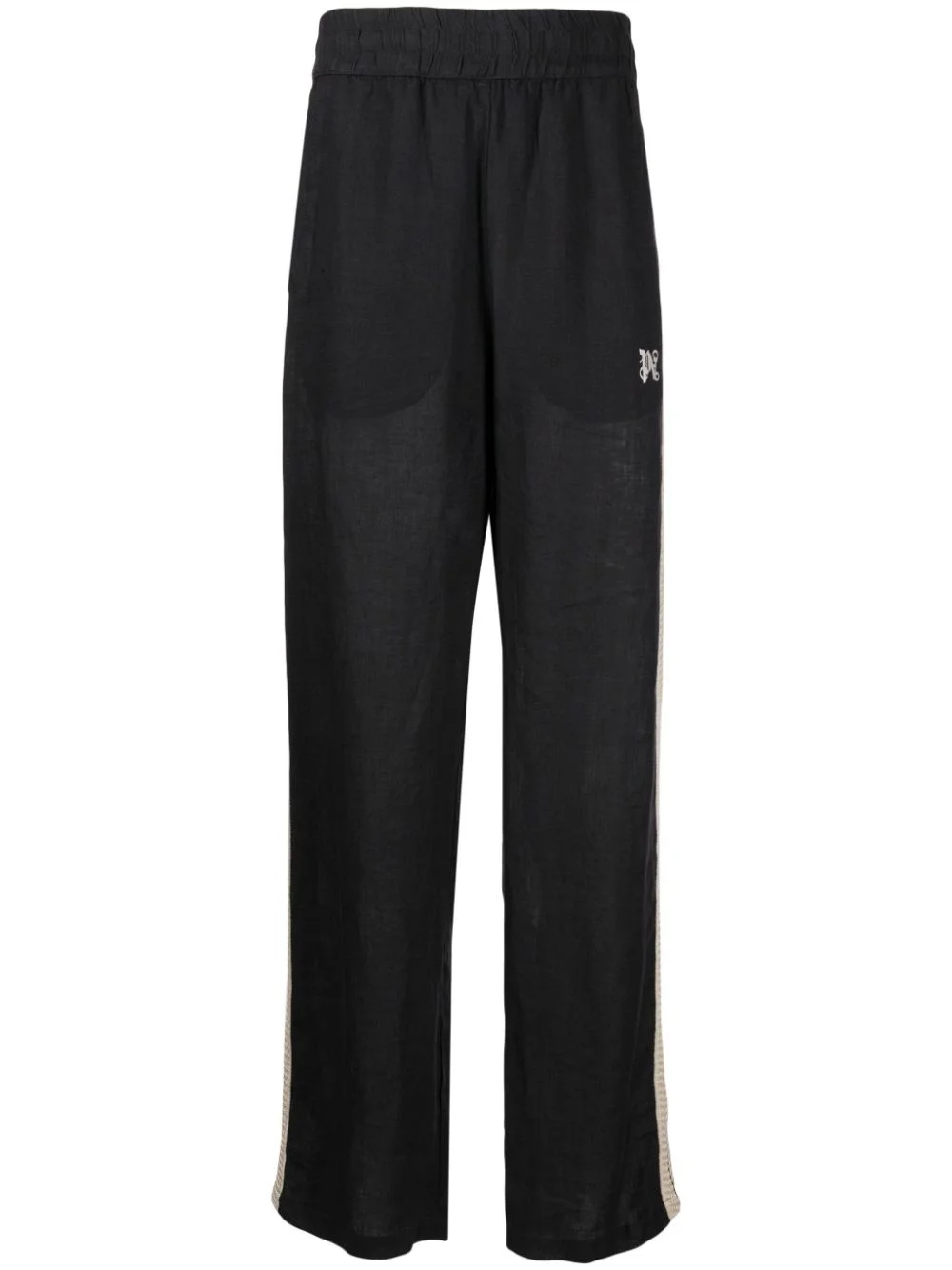 logo-embroidered linen trousers These Palm Angels trousers are punctuated with seasonal side stripes in contrasting embroidery, adding a touch of style. The sport-inspired silhouette gains a lighter look thanks to the linen construction, while a small logo subtly enhances the design. Highlights - Black/taupe - Linen/cotton - Embroidered logo to the side - Side stripe detailing - Elasticated waistband - Two side slit pockets - Straight leg Made in Italy Composition Cotton 100%, Polyester 100% Body: Linen/Flax 100% SIZE & FIT Model measurements Height 6 ft 3 in(1.9 m) Bust/Chest 35.03 in(89 cm) Hips 36.61 in(93 cm) Waist 29.13 in(74 cm) FittingInformation Designed for a relaxed straight leg, allowing a comfortable and loose fit over the leg Adjust this piece’s waistband to your preference using the drawstring Made from a midweight non-stretch fabric This piece fits true to size – take your usual size Washing instructions Machine Wash