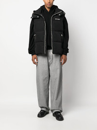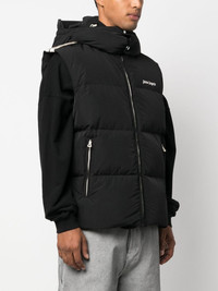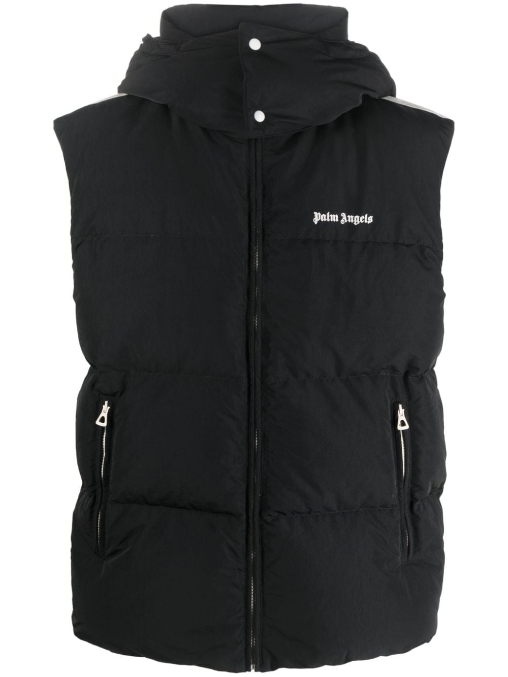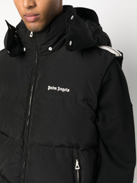 logo-embroidered puffer gilet Palm Angels' Milanese sartorial know-how informs the dynamic construction of this padded gilet. Down-filled for enhanced warmth and insulation, it's decorated at the shoulders with contrasting white stripes before being stamped at the chest with the brand's signature logo print. Highlights - Black - Feather down - Padded design - Embroidered logo to the front - Stripe trim - Drawstring hood - Sleeveless - Front zip fastening - Two side zip-fastening pockets - Silver-tone hardware - Straight hem Made in Italy Composition Outer: Polyamide 59%, Polyester 41% Lining: Polyamide 100%, Polyester 100%, Down 80%, Feather 20% SIZE & FIT Model measurements Height 6 ft 2 in(1.88 m) Bust/Chest 36.61 in(93 cm) Hips 37.79 in(96 cm) Waist 28.74 in(73 cm) FittingInformation Designed for a boxy fit, intended for a loose fit throughout Made from a padded non-stretch fabric, giving it no natural elasticity This piece fits true to size – take your usual size Washing instructions Machine Wash