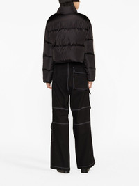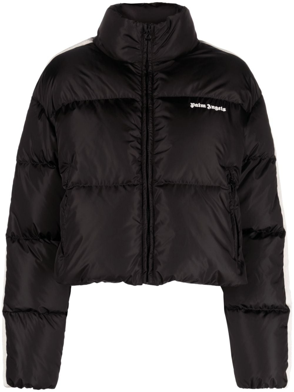 logo-embroidered puffer jacket This Palm Angels puffer jacket is imbued with street-style energy. Filled with insulative feather down, it's decorated with stripes that run down the sleeves, whilst the familiar tattoo-inspired logo lettering is embroidered on the chest in contrasting white threads. Highlights - Black/white - Feather down - Padded design - Embroidered logo at the chest - Side stripe detailing - Funnel neck - Front zip fastening - Long sleeves - Two side zip-fastening pockets Made in Italy Composition Outer: Polyamide 100%, Polyester 100% Lining: Polyamide 100%, Polyester 100%, Down 80%, Feather 20% SIZE & FIT Model measurements Height 5 ft 10 in(1.78 m) Bust/Chest 29.92 in(76 cm) Hips 34.64 in(88 cm) Waist 23.62 in(60 cm) FittingInformation Designed to be unstructured, offering a loose fit throughout The internal drawstring at the hem allows for fitted preferences Made from a padded non-stretch fabric, giving it no natural elasticity This piece fits true to size – take your usual size Washing instructions Machine Wash