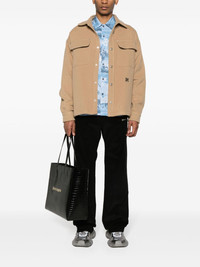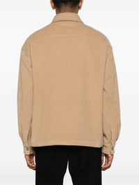logo-embroidered shirt jacket The silhouette and beige colour of this Palm Angels shirt jacket borrow from workwear styles. It’s crafted from felted virgin wool and branded with logo hardware and an embroidered Old English monogram at the front. Highlights - Beige - Virgin wool - Felted - Logo-engraved buttons - Pointed flat collar - Drop shoulder - Long sleeves - Buttoned cuffs - Two chest flap pockets - Rivet detailing - Embroidered logo to the front - Two side slit pockets - Straight hem - Unlined - Front press-stud fastening Made in Italy Composition Virgin Wool 100%, Polyester 100% Washing instructions Dry Clean Only
