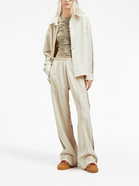 logo-embroidered track shirt This track shirt by Palm Angels captures the collection's penchant for combining tailoring pieces with the brand's renowned streetwear ascendence. Imagined in cream white, the silhouette gains contrast with a side stripe detailing, while a tonal logo completes the design. Highlights - Cream white/beige - Embroidered logo at the chest - Side stripe detailing - Classic collar - Front press-stud fastening - Long sleeves - Buttoned cuffs - Straight hem Made in Italy Composition Polyester 100%