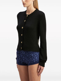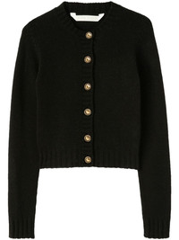 curved-logo wool-blend cardigan Highlights - Black - Wool blend - Knitted construction - Intarsia-knit logo - Gold-tone buttons - Round neck - Front button fastening - Long sleeves - Straight hem Made in Italy Composition Wool 80%, Polyamide 20% Washing instructions Read Manufacturer Guidelines