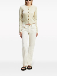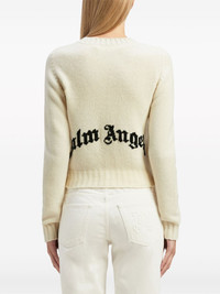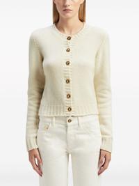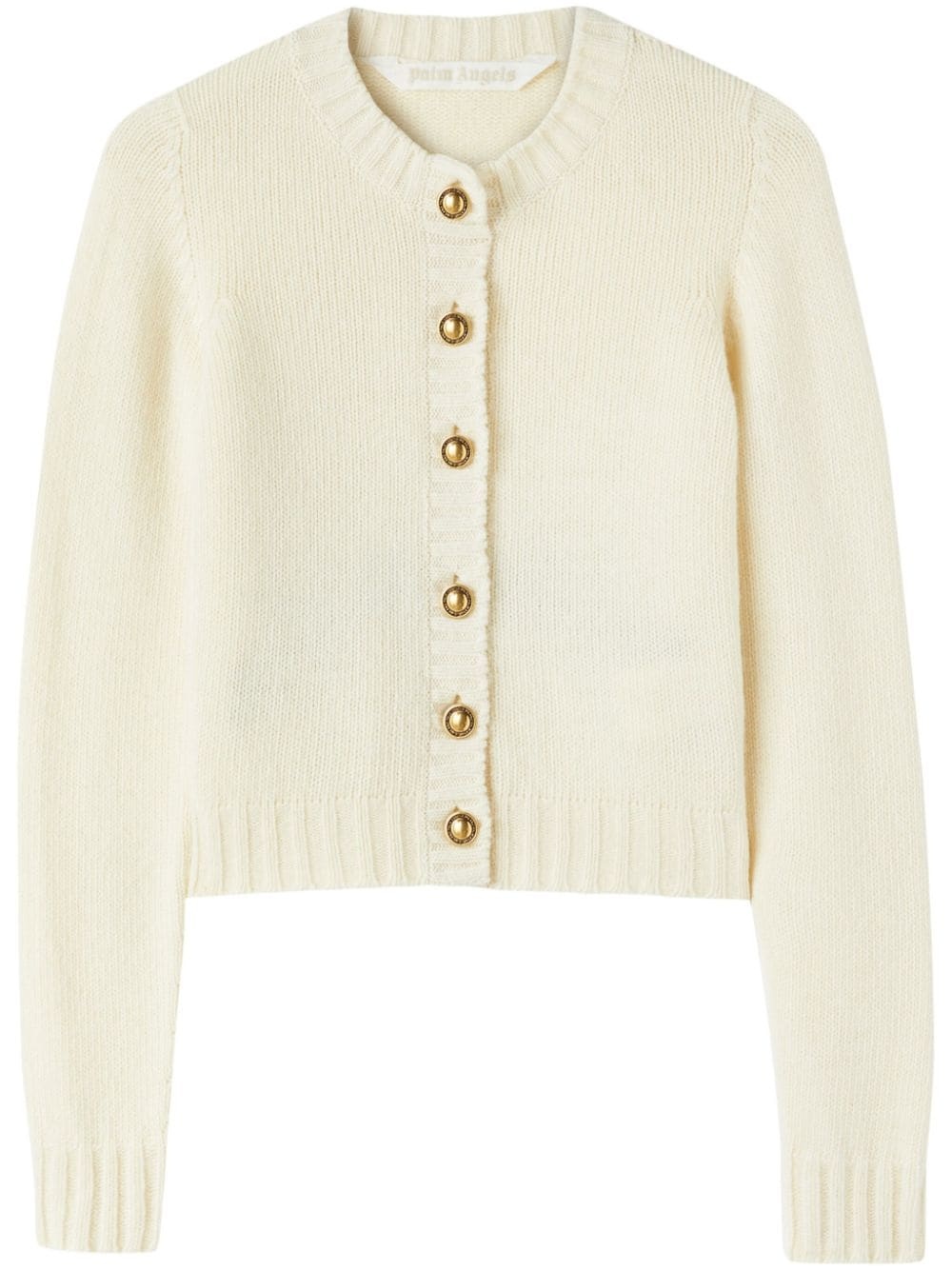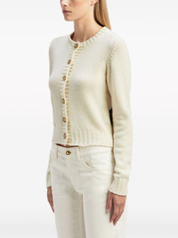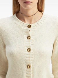 curved-logo wool-blend cardigan Highlights - Cream white - Wool blend - Knitted construction - Intarsia-knit logo - Gold-tone buttons - Round neck - Front button fastening - Long sleeves - Ribbed cuffs and hem - Straight hem Made in Italy Composition Wool 80%, Polyamide 20% Washing instructions Dry Clean Only