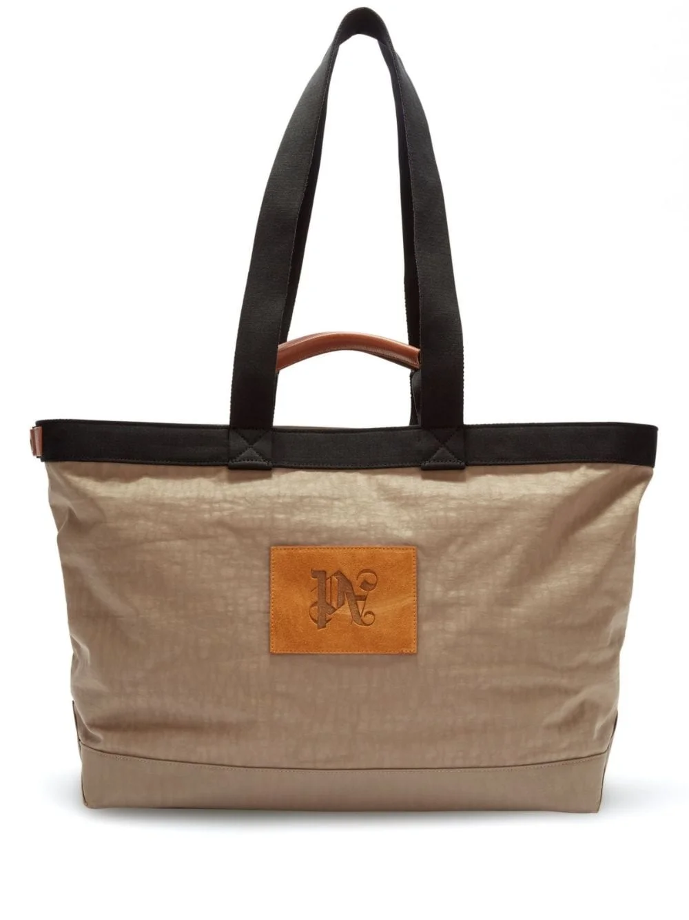 logo patch tote bag Made in Italy from smooth calf leather, this spacious tote from Palm Angels is defined by its two-tone design. Boasting a versatile beige construction, this accessory is elevated with contrasting brown shoulder straps and an embossed logo patch at the front. Highlights - Beige/brown - Calf leather/cotton - Wide shoulder straps - Circular top handles - Logo patch to the front - Main compartment Made in Italy Composition Outer: Calf Leather 100%, Polyamide 100% Lining: Cotton 100%