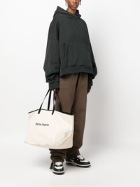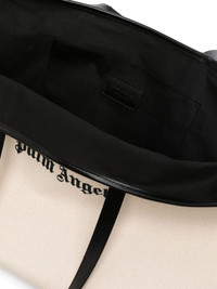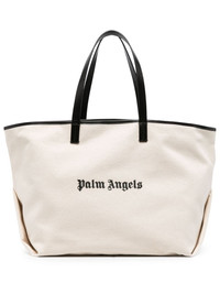 logo-print canvas tote bag Palm Angels offers a blend of practicality and contemporary style with this tote bag. Detailed with a large graphic to the front, it is finished with a spacious compartment and leather top handles. Highlights - White/black - Cotton - Canvas - Leather trim - Leather top handles - Main compartment - Internal logo patch Made in Italy Composition Outer: Cotton 100%, Calf Leather 100% Lining: Cotton 100% SIZE & FIT Measurement DEPTH 11.81 in(30 cm) HANDLE 8.66 in(22 cm) HEIGHT 12.59 in(32 cm) WIDTH 13.77 in(35 cm)