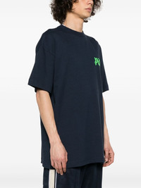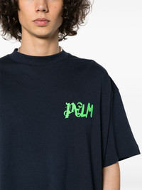 logo-print cotton T-shirt The back of this navy Palm Angels T-shirt is printed with a photograph of a skatepark taken by founder Francesco Ragazzi. The slogan and seasonal lettering looks as though it’s been scribbled directly on the image in neon-green writing. Highlights - Navy blue - Cotton - Jersey texture - Ribbed crew neck - Short sleeves - Logo print at the chest - Graphic print to the rear - Slogan print to the rear Imported Composition Cotton 100% SIZE & FIT Model measurements Height 6 ft 2 in(1.87 m) Bust/Chest 36.61 in(93 cm) Hips 35.03 in(89 cm) Waist 27.95 in(71 cm) FittingInformation Designed to be unstructured, offering a loose fit throughout Made from a midweight non-stretch fabric, this piece offers minimal elasticity when worn This piece fits true to size – take your usual size Measurement CHEST 44.01 in(111.8 cm) SLEEVE LENGTH 7.99 in(20.3 cm) LENGTH 29.01 in(73.7 cm) Washing instructions Hand Wash