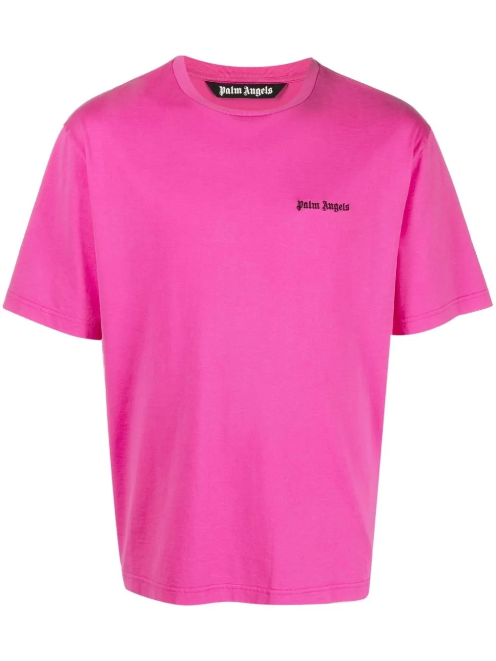 logo-print cotton T-shirt Crafted from vivid fuchsia pink cotton, this classic T-shirt by Palm Angels is punctuated with logo lettering on the chest in the label's signature gothic script. Highlights - Fuchsia pink - Cotton - Crew neck - Logo print at the chest - Short sleeves - Straight hem Made in Italy Composition Cotton 100% Washing instructions Machine Wash