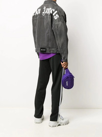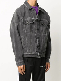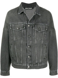 logo-print denim jacket You no longer need to worry about those haters, this Palm Angels logo - denim jacket - got your back if they ever come bother you again. Now you're safe. Highlights - Black - Cotton/leather - Classic collar - Front button fastening - Two front flap pockets - Two front welt pockets - Long sleeves - Buttoned cuffs - Straight hem - Logo print to the rear - Logo patch to the rear Made in Italy Composition Lining: Polyester 65%, Cotton 35% Outer: Cotton 100%, Leather 100% Washing instructions Machine Wash
